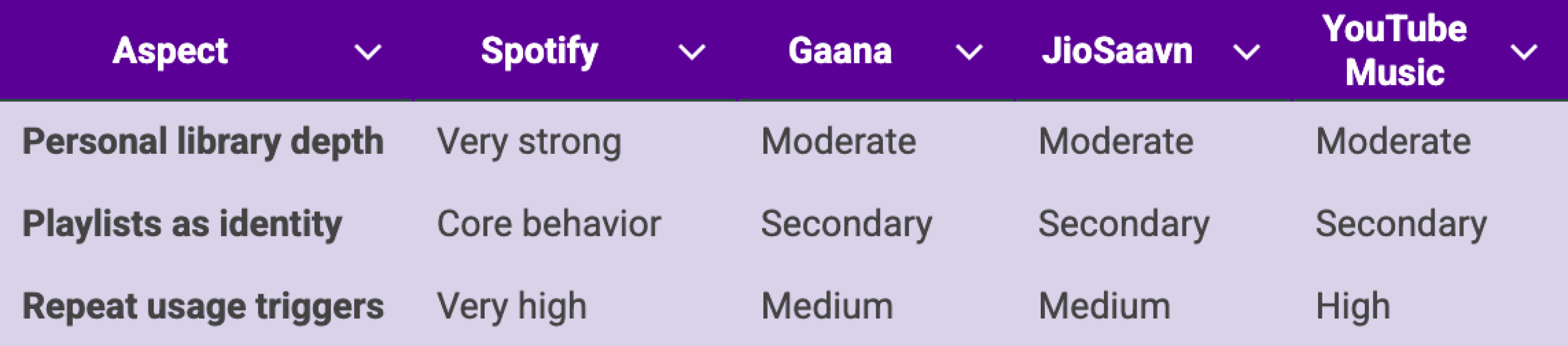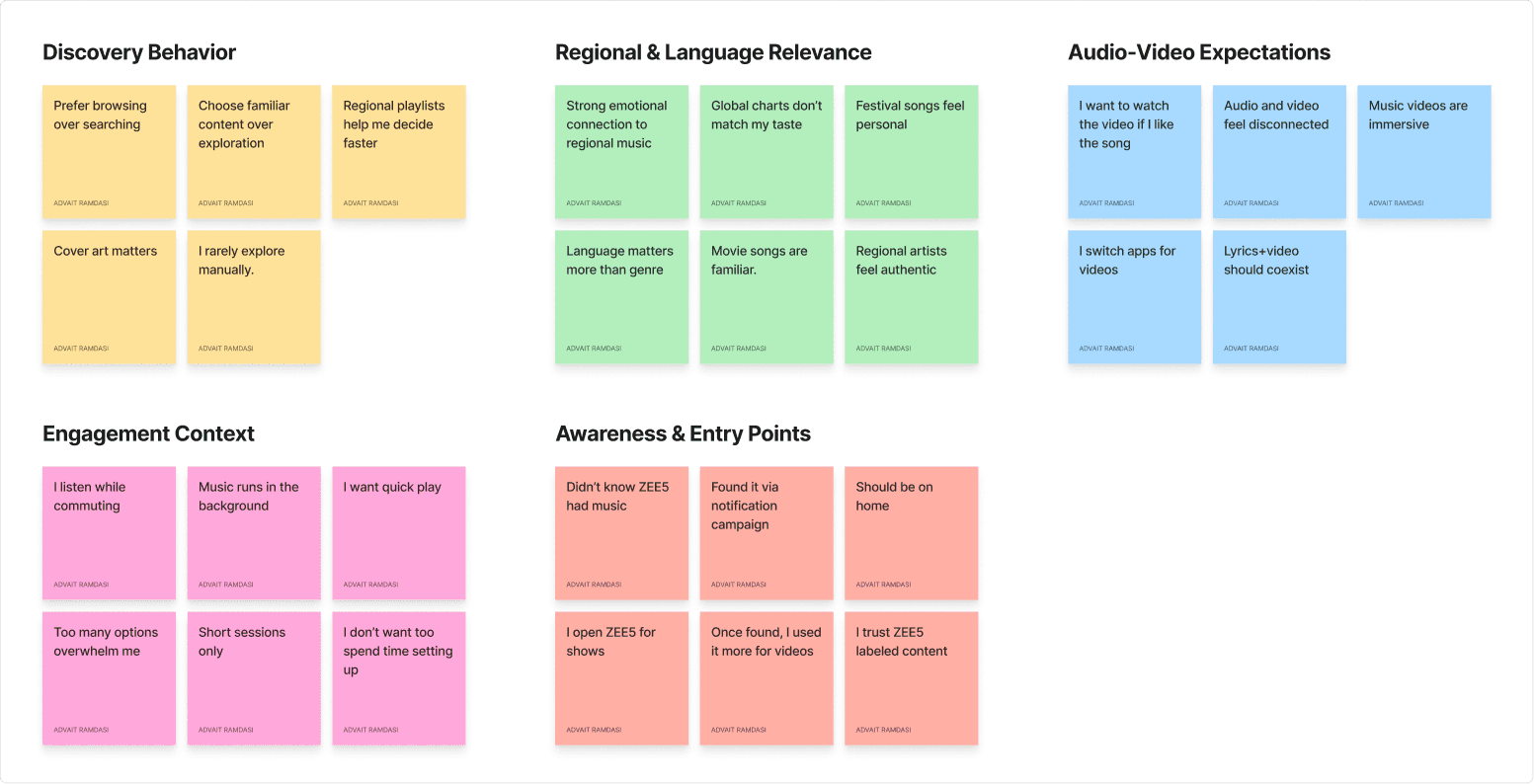 To synthesize insights from user interviews, surveys, and focus groups, we conducted an affinity mapping exercise to identify recurring behaviors, motivations, and pain points related to music consumption within an OTT context.